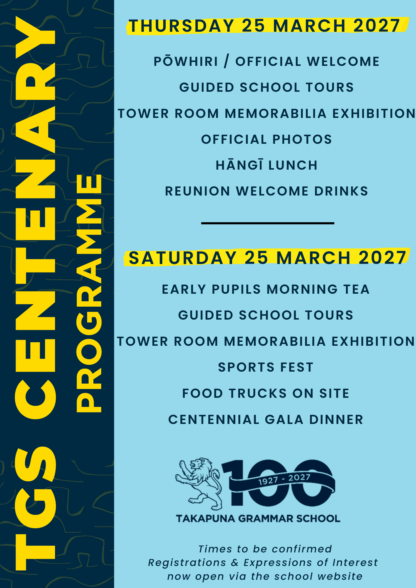 Centenary events will be held over Easter weekend, Thursday 25 to Saturday 27 March 2027.