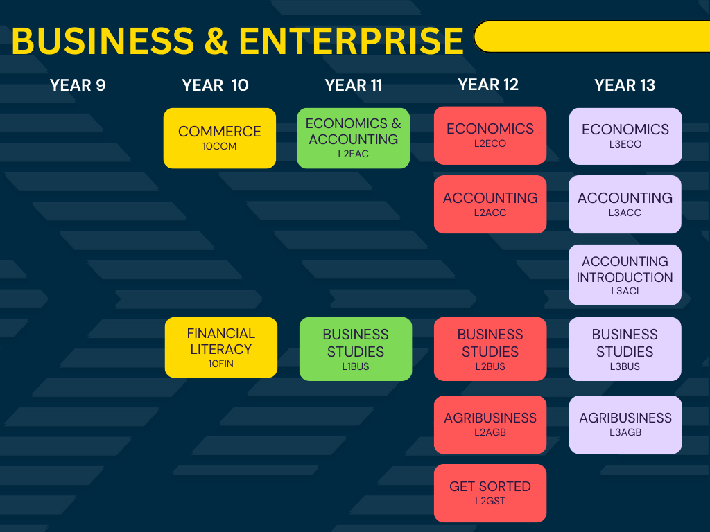 The world of business and allows students to develop a valuable understanding of how businesses operate within the New Zealand economy. Students will understand how a business' pūtake shapes their operations and how they position their goods and services in the marketplace. The key concepts of Enterprise, Citizenship and Sustainability within the circular economy principles will be explored.